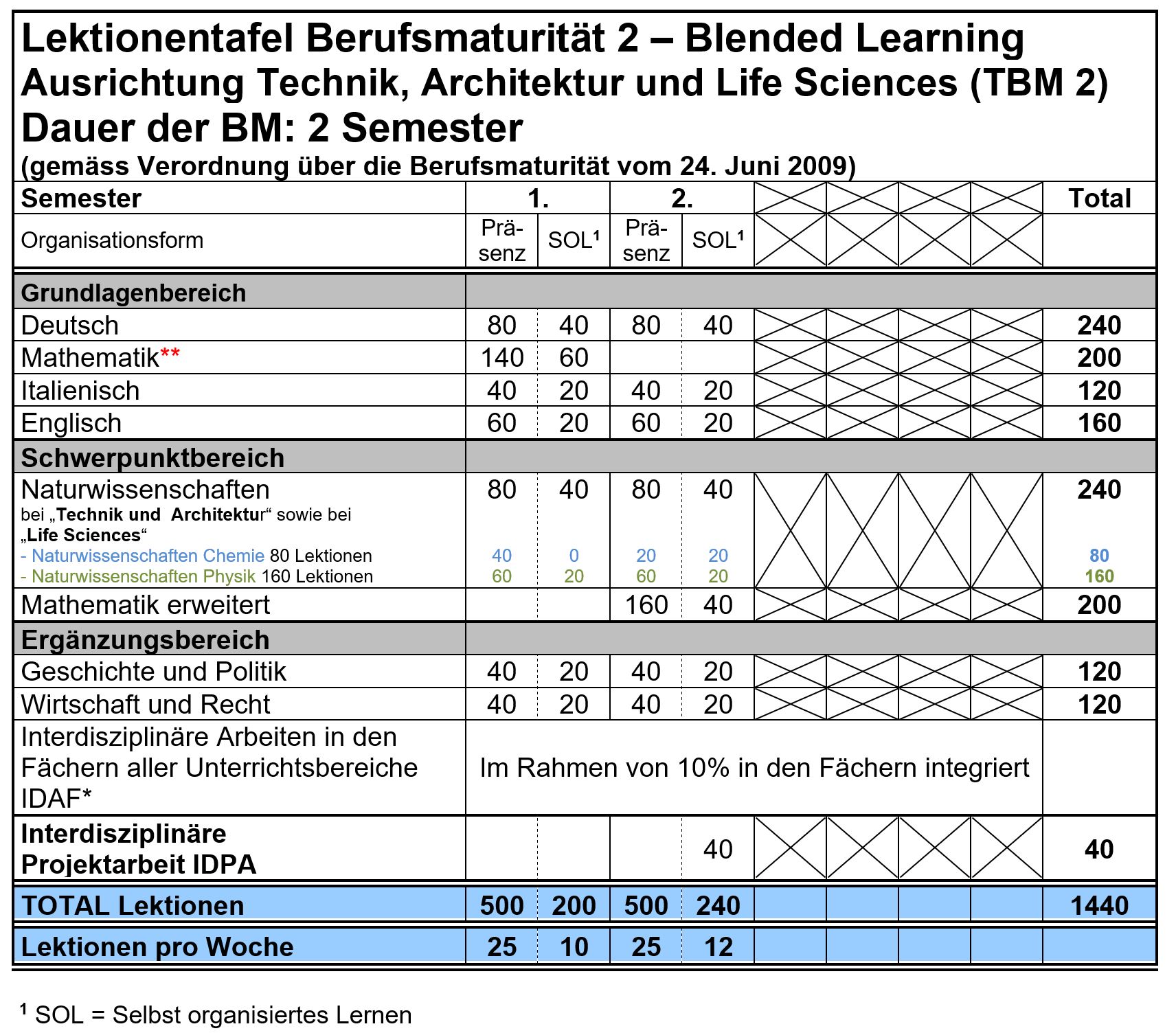 Die Berufsmaturität Ausrichtung Technik, Architektur und Life Sciences hat ihren Schwerpunkt in den Bereichen Mathematik und Naturwissenschaften. Sie ist in der Regel Voraussetzung für ein Studium an einer Fachhochschule technischer Ausrichtung und ermöglicht den prüfungsfreien Zugang zu einem Studium in der Fachrichtung des erlernten Berufes.